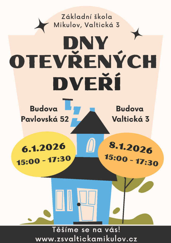Rádi bychom Vás pozvali na Dny otevřených dveří na naší škole. Obě naše budovy si budete moci prohlédnout mezi 15:00 a 17:30 hodinou.